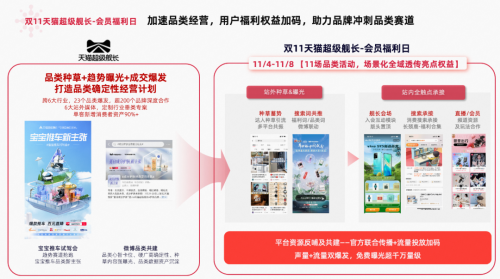 在双11期间的11场活动中,天猫超级舰长每场都有大量传播资源支持,并提供丰厚的站内外流量反哺,资源扶持力度远超日常,助力商家声量和流量双爆发。