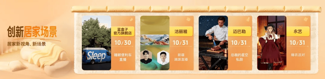 蓝盒子睡眠便利车打造移动试睡空间,打破空间局限,让用户近距离体验舒适睡眠,让“近距离体验舒适睡眠”不再受时间和地点限制;洁丽雅新疆溯源直击原料产地,呈现天然棉品的诞生全过程;迈巴勒星空私厨解锁厨房新体验,用厨具演绎星空下的美味盛宴;永艺睡衣派对融合趣味与舒适,以主题场景传递居家放松理念,全方位满足用户多元购物需求。