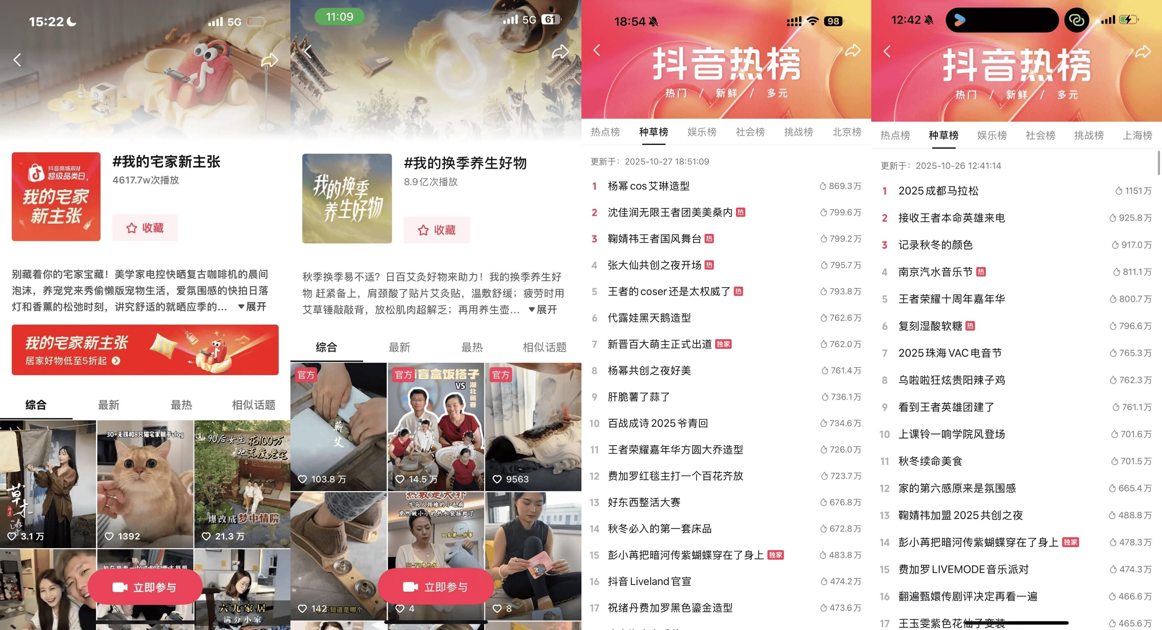 #一眼就沉沦的貌美家居,精准激发颜值消费;#躺平式养宠太有生活了 ,巧妙切入方兴未艾的人宠共居趋势;#秋冬必入的第一套床品,激活换季家居刚需购买需求;#家的第六感是氛围感 以家居生活情绪场景切入。